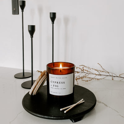 Our brand-new scent, Cypress and Fig, is an exotic blend of ripe fig and tropical fruits grounded with cypress, eucalyptus, and musk scent notes. It smells like you're walking through a cypress forest with sweet fig that shines through, with fresh eucalyptus to balance it all out. We love this ambrosial scent because it's truly one of those candles that you can burn all year long!