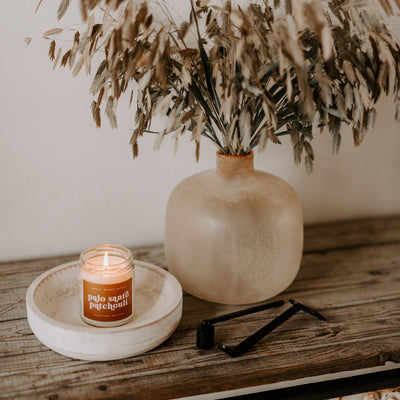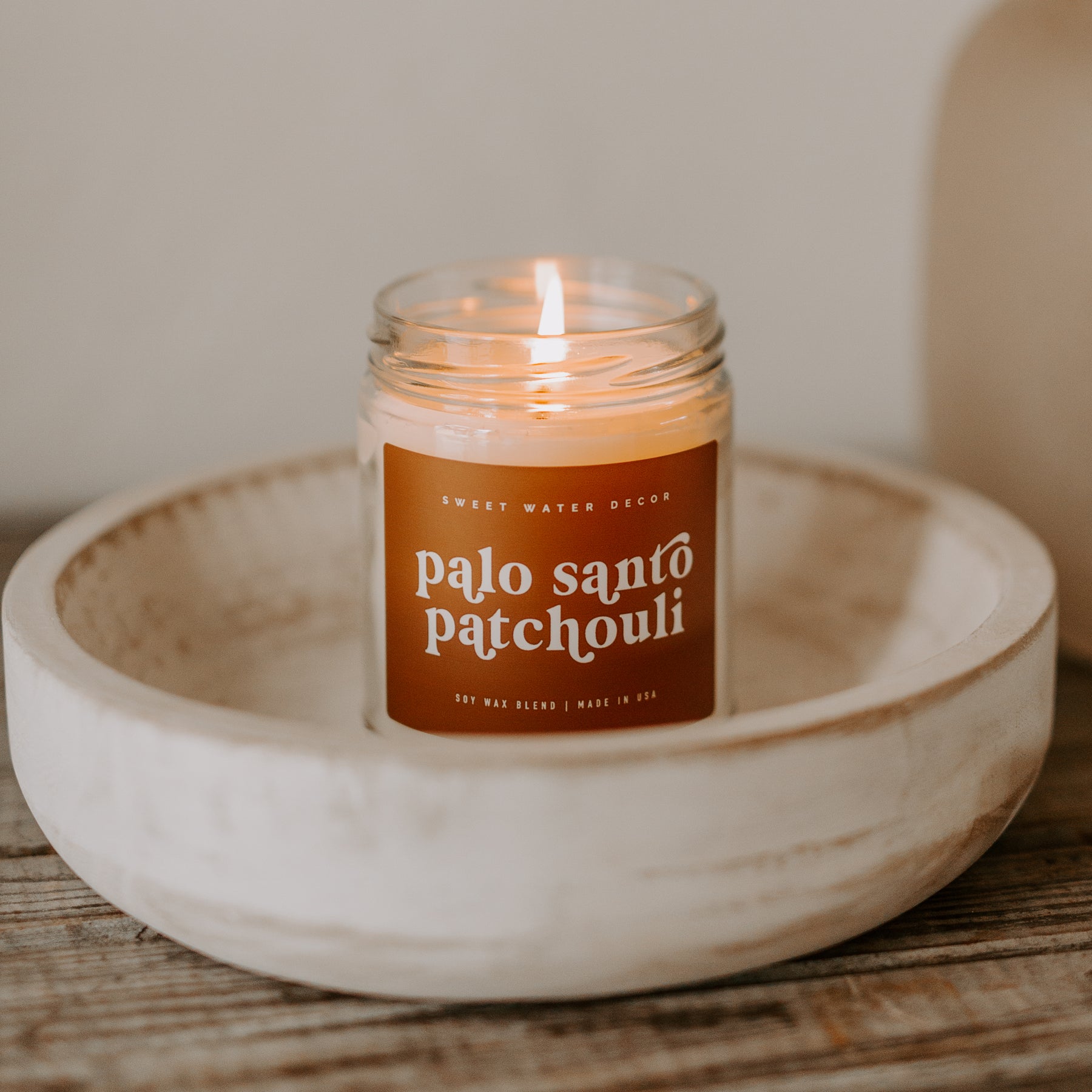 Palo Santo Patchouli candle is an aromatherapy candle for stress relief. Sit back and go into relaxation mode when this soft vanilla, patchouli, musk and sandalwood scent moves through your space. This is one of our best smelling soy candles for home.Â